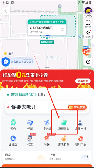 2、点击进入后,可以看到打车相关的操作界面。点击“高德拼车”功能。